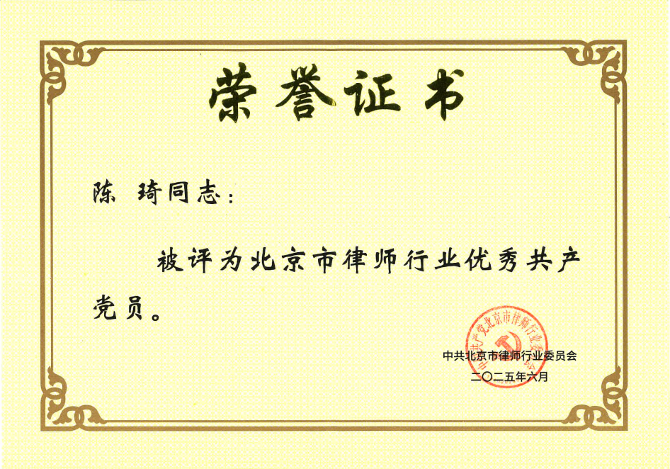 此次获评“北京市律师行业优秀共产党员”,不仅是对陈琦律师个人的肯定,更激励着广大律师党员以更饱满的热情投身法治实践。未来,陈琦律师将继续以党员标准严格要求自己,在专业领域精益求精,在社会服务中主动作为,用实际行动诠释“人民律师为人民”的深刻内涵,为律师行业党建工作和法治建设发展贡献更大力量。